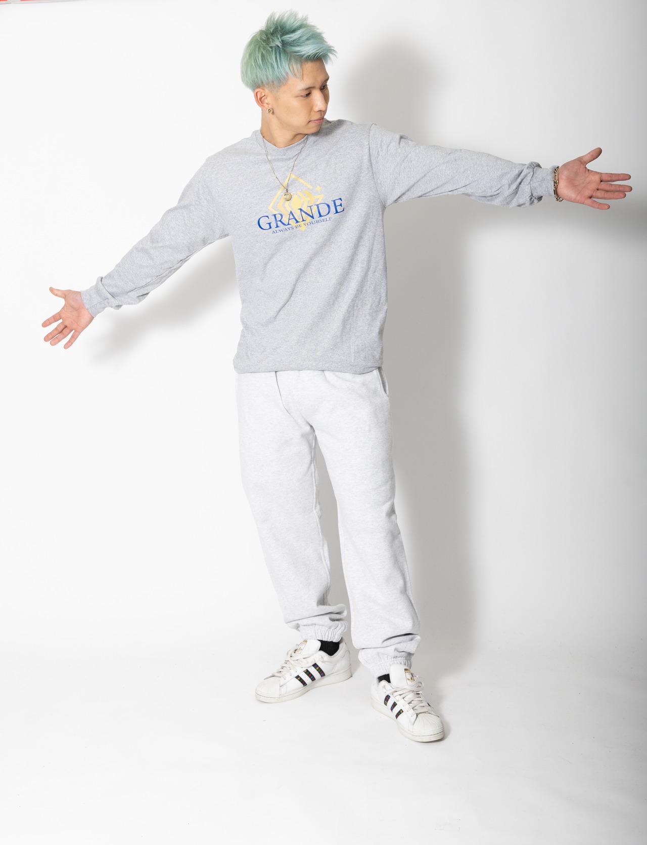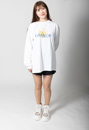 アートが息づくデザイン:袖に施された大胆なGRANDEロゴプリントが、シンプルな中に個性を際立たせます。