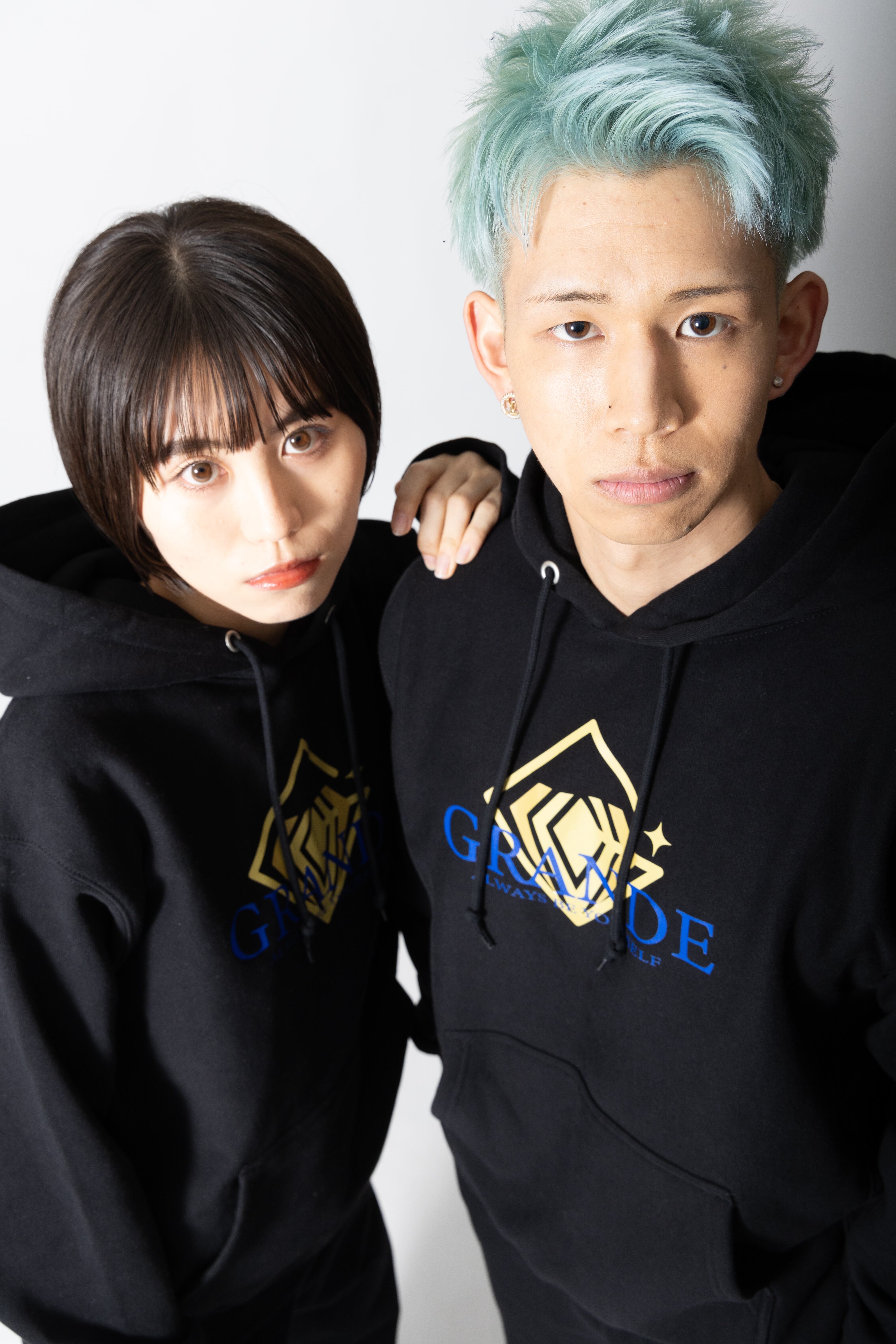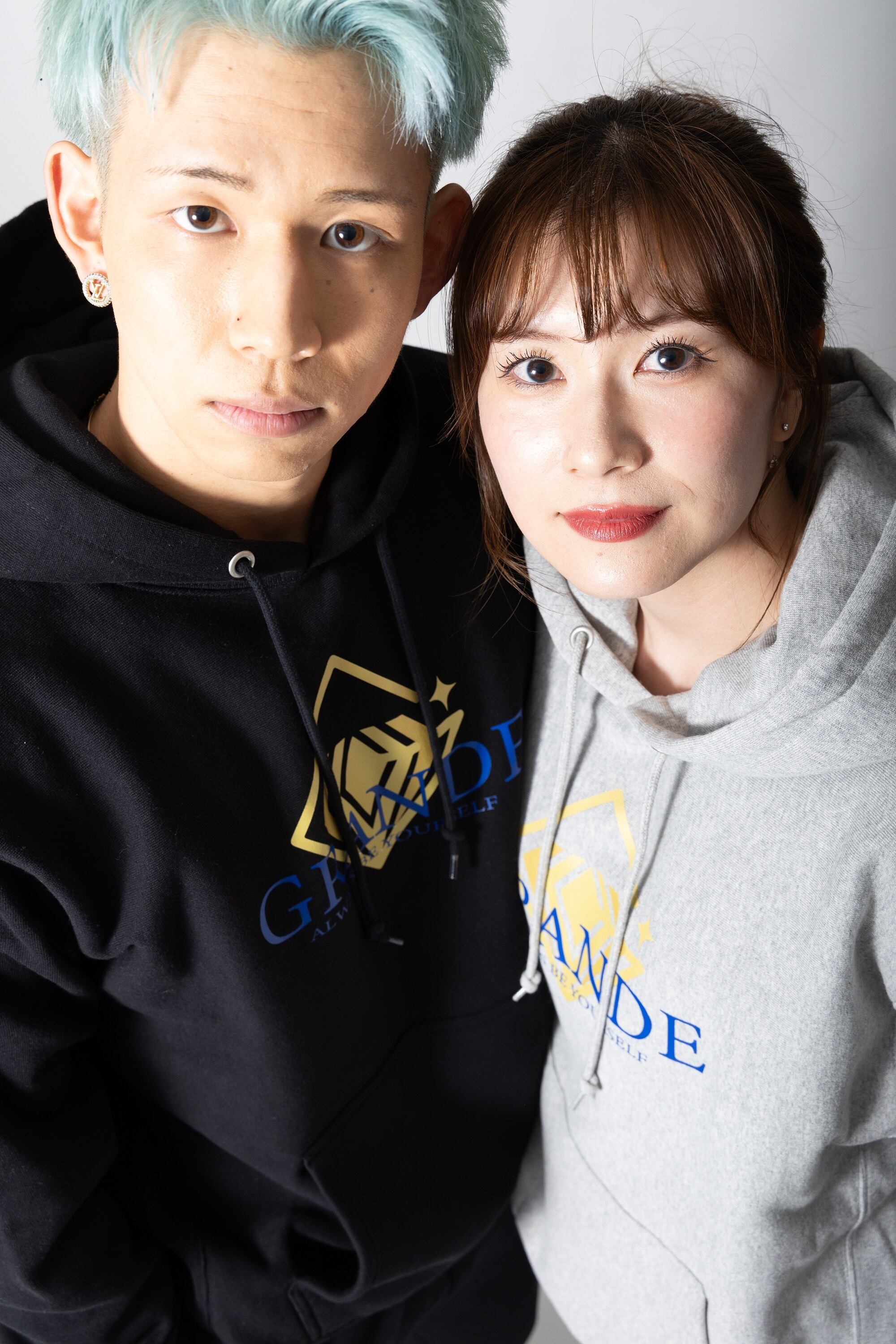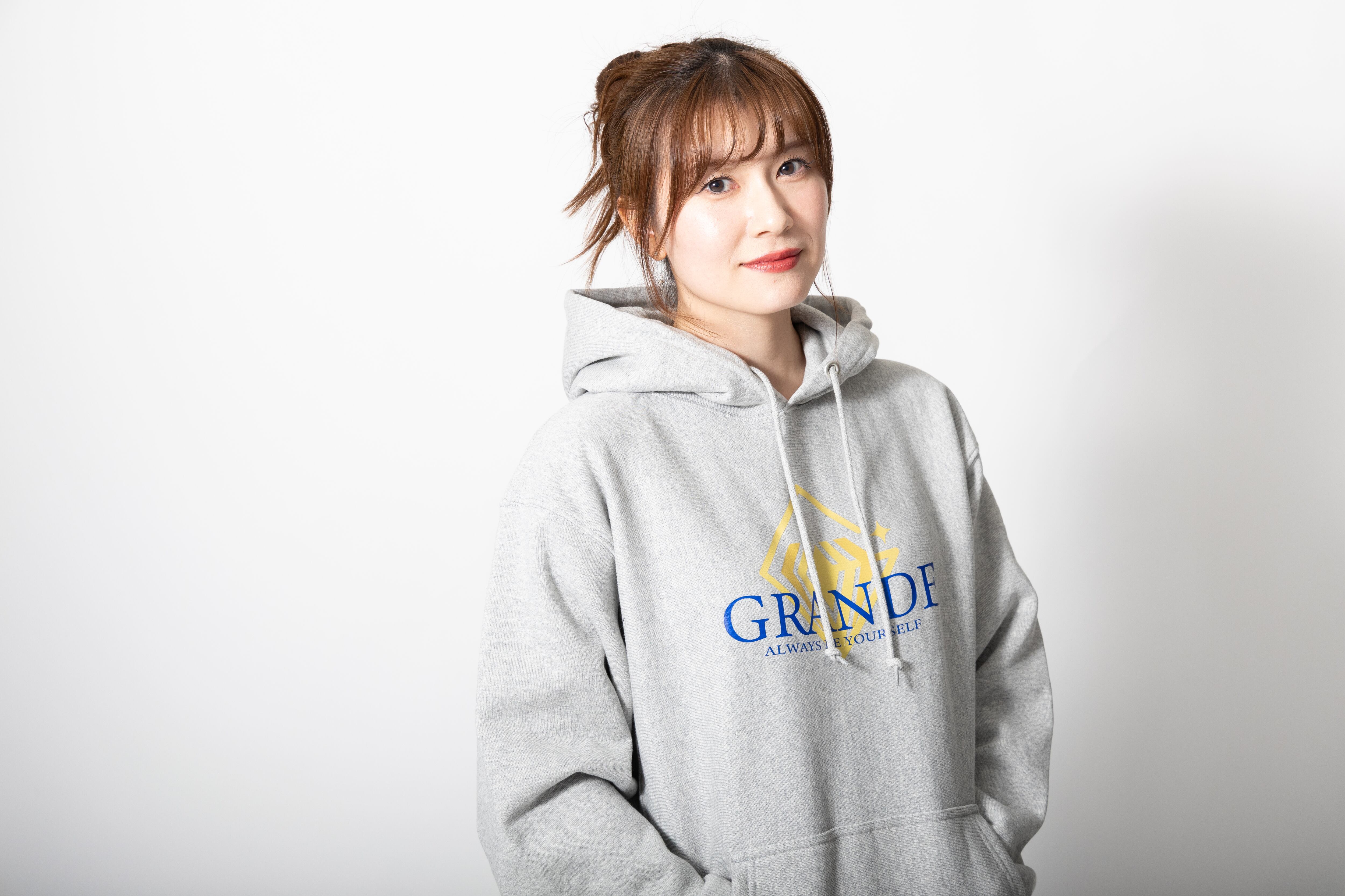 洗練されたデザイン:フロントにさりげなくあしらわれたGRANDEの刺繍ロゴとフルジップ仕様が、控えめながらも存在感を放つ。